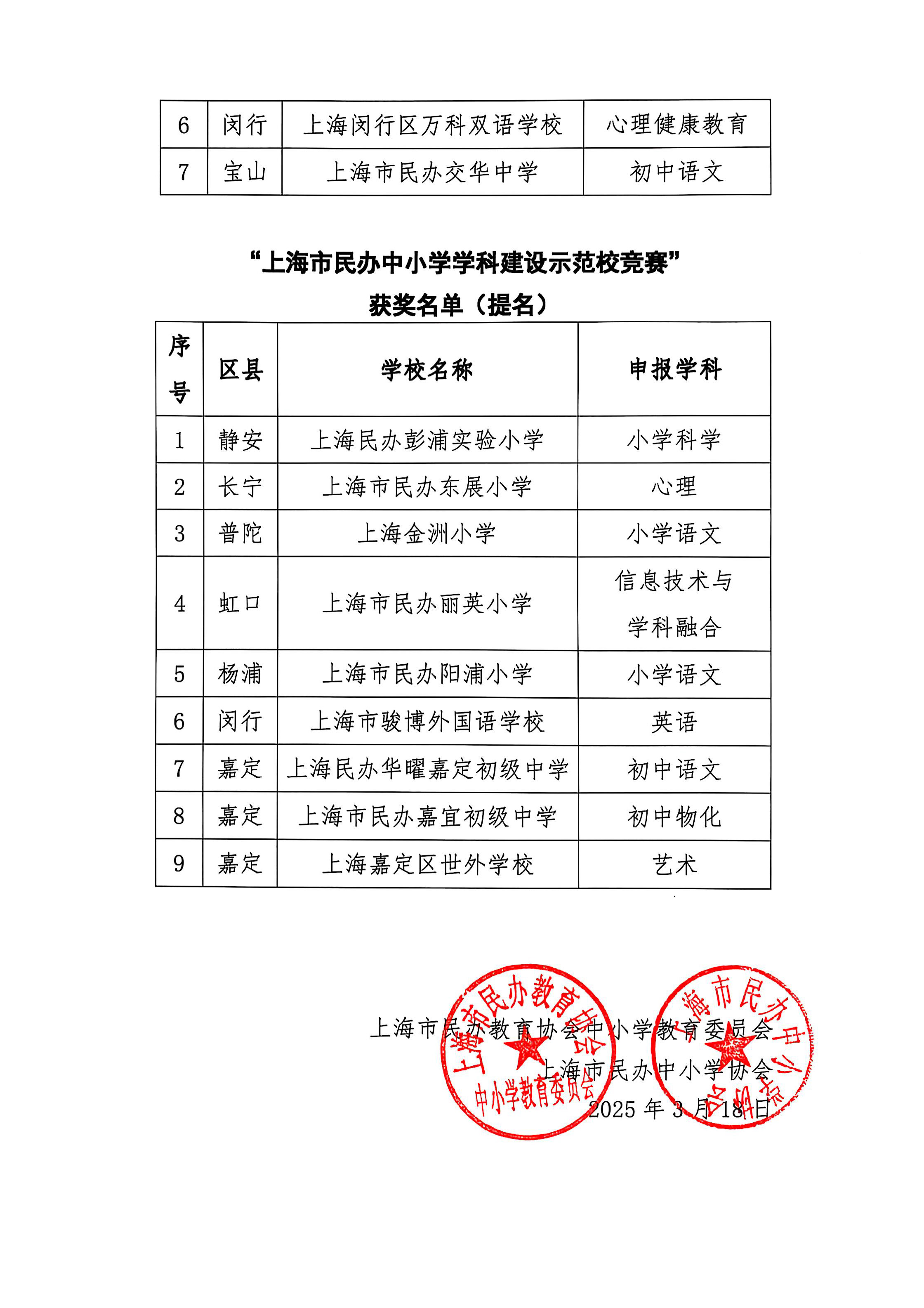 “上海市民办中小学学科建设示范校”竞赛获奖名单